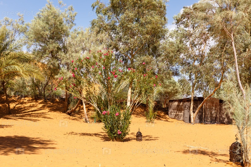Зеленые деревья в оазисе в пустыне Сахара, Марокко