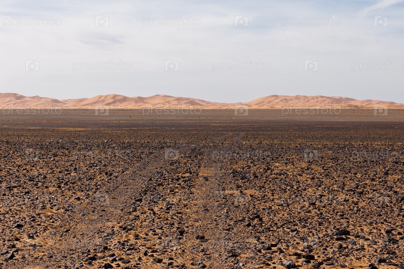 Дорога через каменную пустыню к песчаным дюнам Эрг-Шебби. Пустыня Сахара Марокко