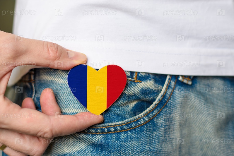 Патриот Румынии! Деревянный значок с флагом Румынии в форме сердца в мужской руке в День национального единства