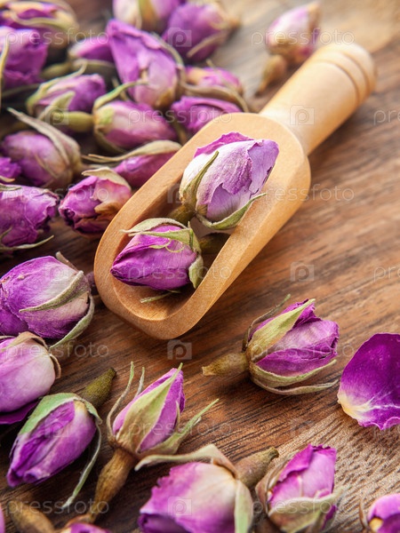 Нежно-розовые высушенные бутоны роз крупным планом внутри и вокруг чайной ложки. Выборочный фокус. Деревянный стол. Вертикальный