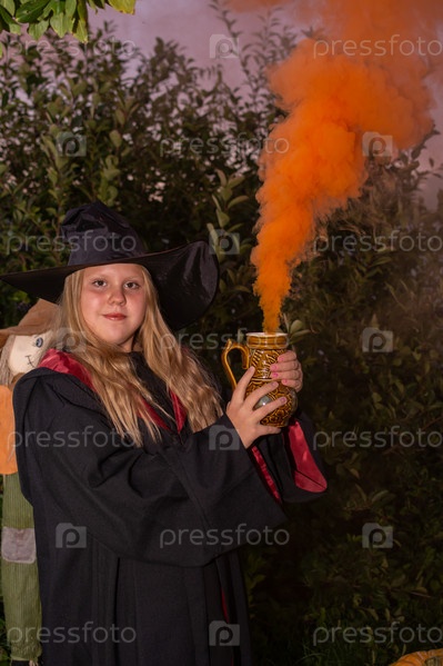 Хэллоуин.Девочка в мантии и шляпе.Маленькая волшебница в костюме.Девушка в халате и шляпе.Маленькая колдунья в костюме