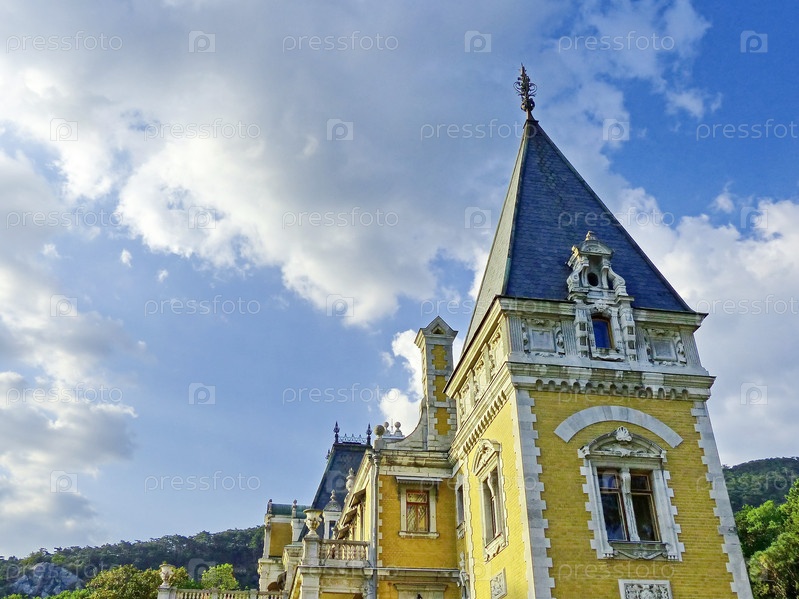 Массандровский дворец Александра III. В отделке дворца много средневековых деталей, прослеживаются архитектурные черты раннего барочного стиля Людовика XIII. Южное побережье Крыма, Верхняя Массандра, Россия, сентябрь 2019 г