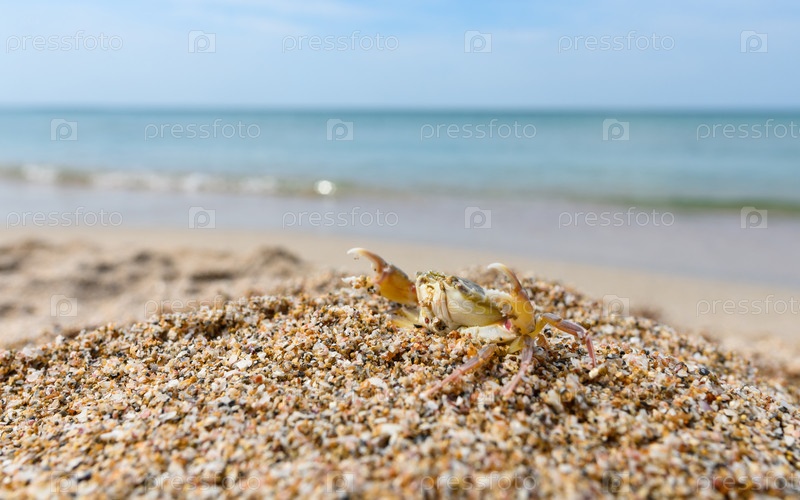 Краб сидит на берегу моря на небольшой песчаной возвышенности с высокими клешнями. Выборочная фокусировка