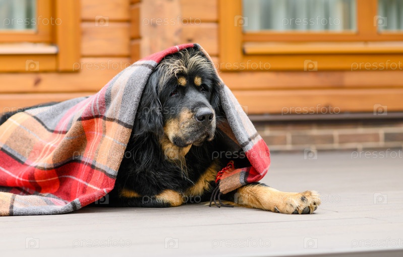 Большая собака лежит на полу, покрытом красным клетчатым одеялом