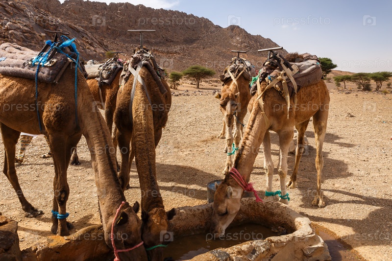 Верблюды пьют воду из колодца в пустыне Сахара, Марокко