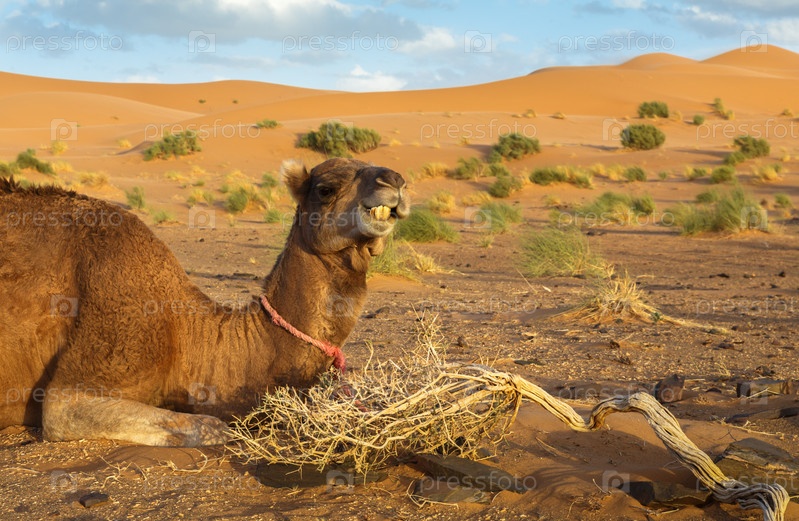 Верблюд лежит на песке на фоне песчаных дюн, пустыня Сахара