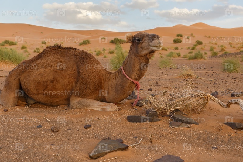 Дромадер в пустыне Сахара. Верблюд лежит на песке. Песчаные дюны на заднем плане
