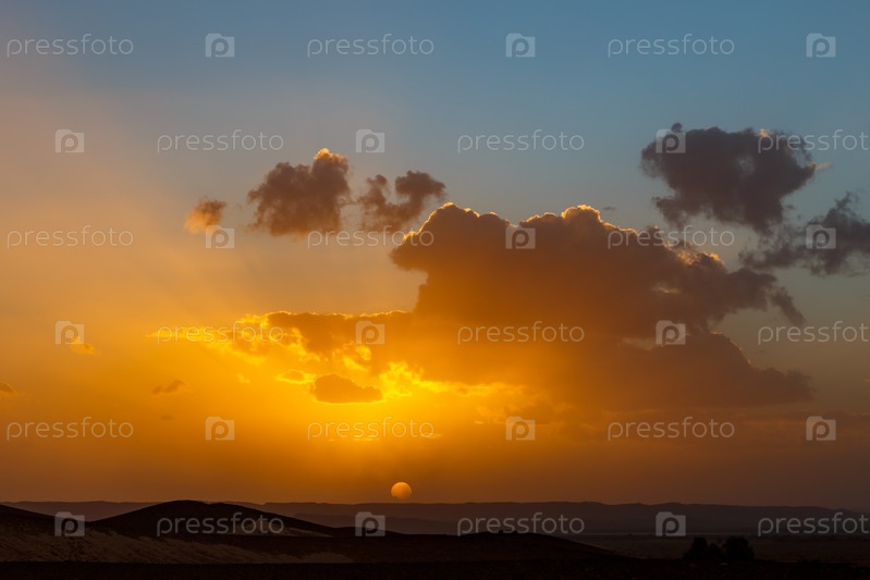 Закат в пустыне Сахара. Красивое небо. Солнце на горизонте