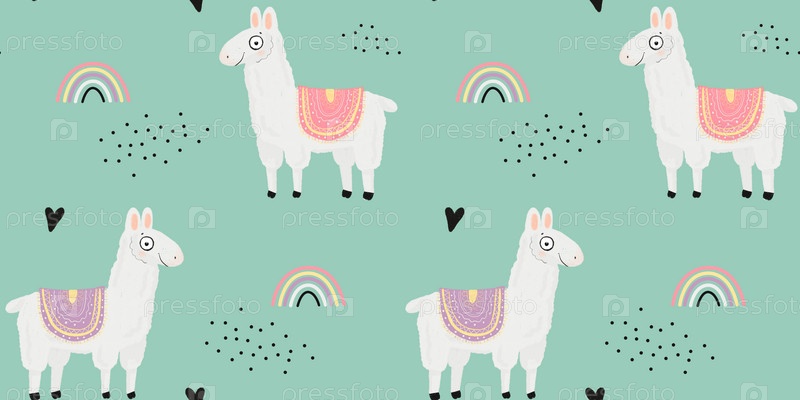 Симпатичный детский узор с ламами. Бесшовные скандинавские обои. Альпаки, ламы, радуги. Принт с животными для дизайна детской одежды, товаров, обоев в детскую комнату, бумаги
