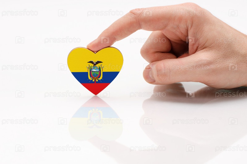 Флаг Эквадора. Любите и уважайте Эквадор. Мужская рука держит сердце в форме флага Эквадора на поверхности белого стекла. Понятие патриотизма и гордости