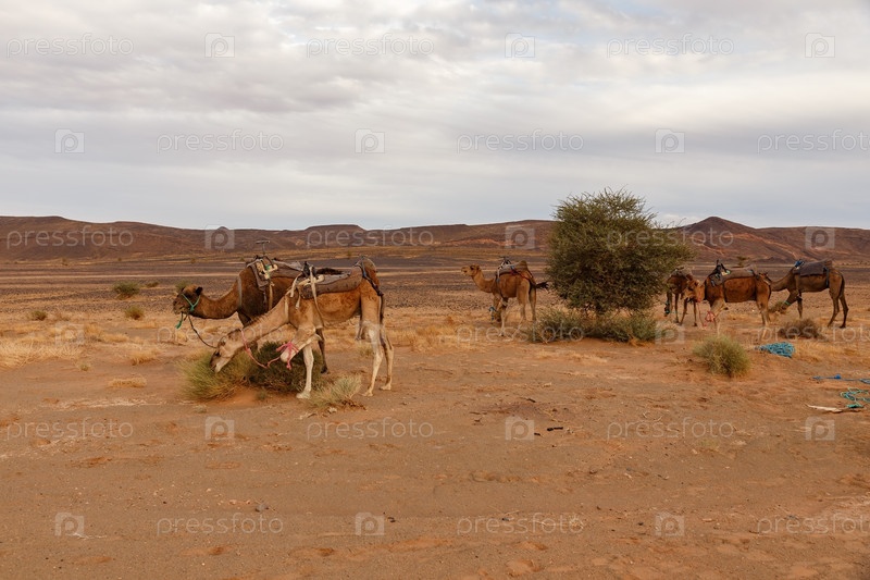 Верблюды пасутся на пастбище в пустыне Сахара. Стадо верблюдов-верблюдов со связанными ногами. Марокко