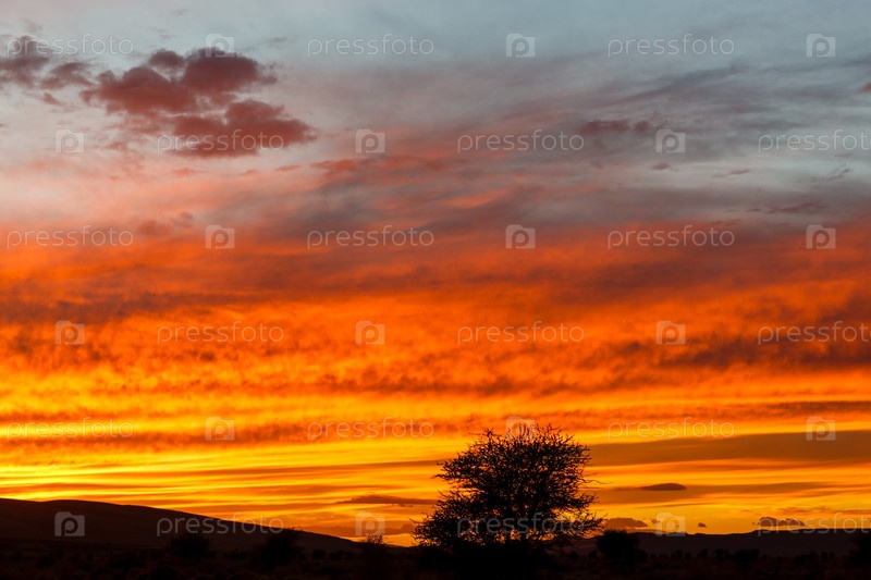Закат в пустыне Сахара, одинокое дерево на фоне красочного неба