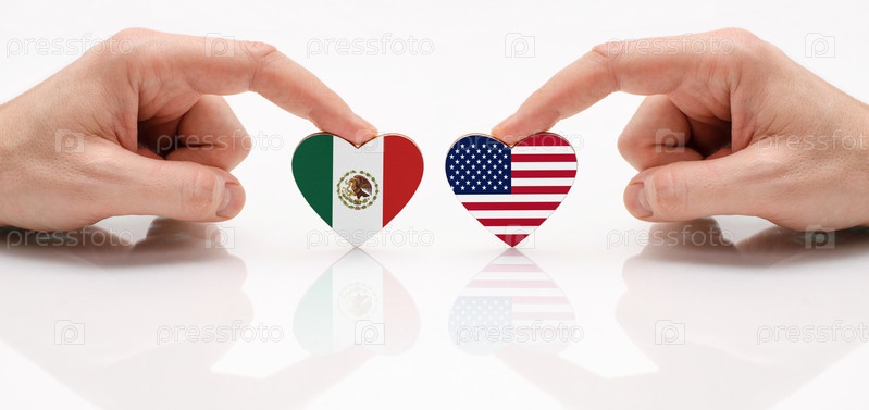 Концепция дружбы и дипломатических отношений между Мексикой и США. Две мужские руки держат флаги в форме сердца на стеклянном столе. Флаг Мексики и США как символ сотрудничества и уважения