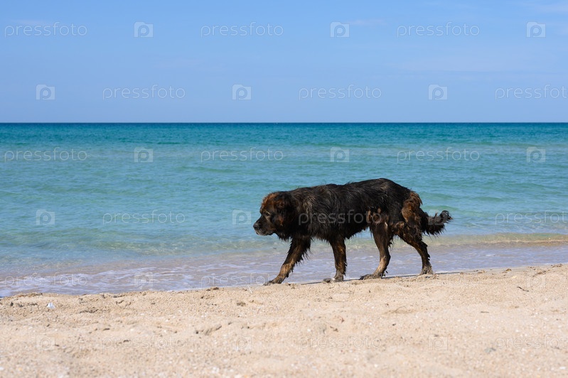 Бродячая собака гуляет по берегу моря. Тибетский мастиф гуляет по пляжу