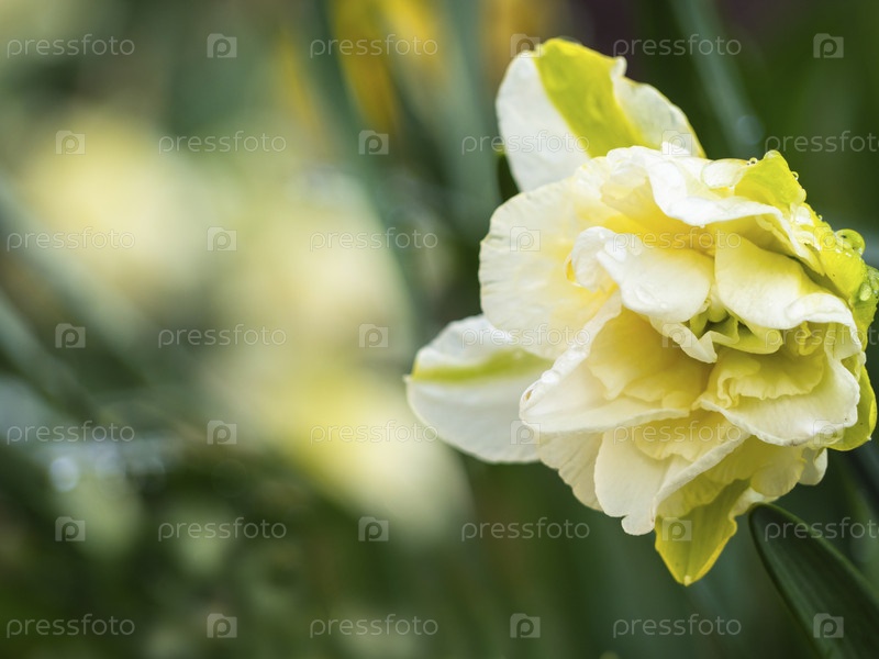 Весенний цветок многолепесткового желто-белого нарцисса в зеленом саду. Один цветок двойного нарцисса на фоне размытых зеленых листьев. Весенняя цветочная открытка