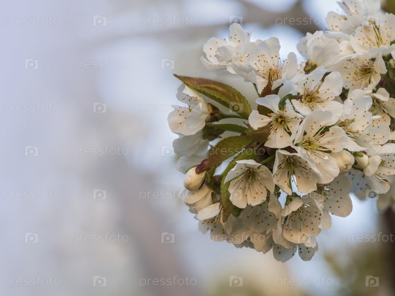 Цветущие деревья с белыми цветами на фоне тонирующего неба. Цветущая красивая белоснежная вишня в весенний день крупным планом