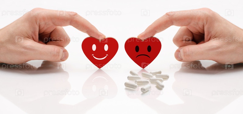 Два сердца со счастливыми и грустными эмоциями. Рядом с грустной эмоцией лежат таблетки. Концепция сравнения здорового сердца и больного