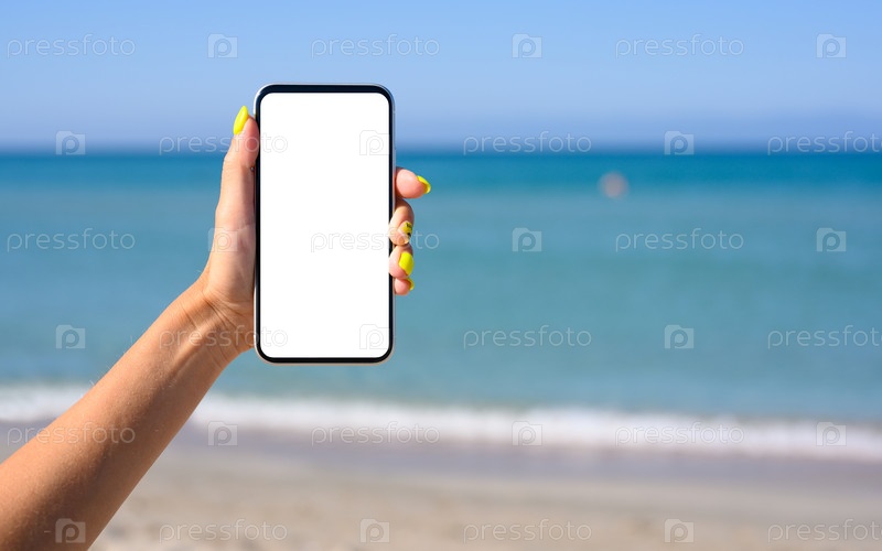 Смартфон с пустым белым дисплеем в женской руке на фоне моря. Концепция использования интернета в отпуске