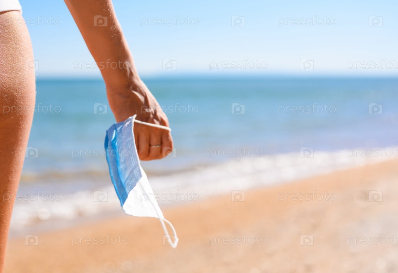 Рука девушки держит медицинскую маску на фоне моря и пляжа. Отдых на море во время эпидемии коронавируса