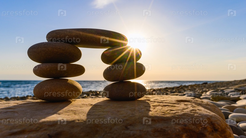 Восход солнца над небольшой галечной башней на пляже. Свободное место справа. Спокойное утро у моря