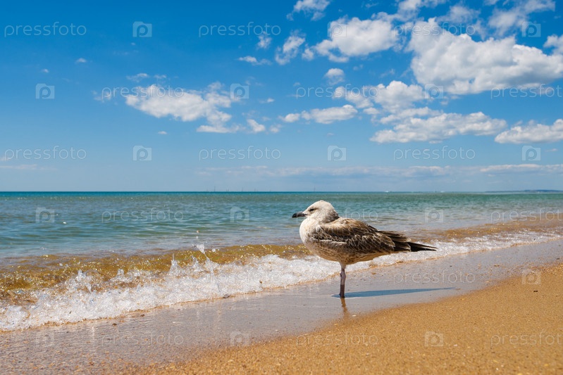 Чайка стоит на фоне красивого морского пейзажа и облачного неба. Морская птица стоит у кромки воды на песчаном берегу