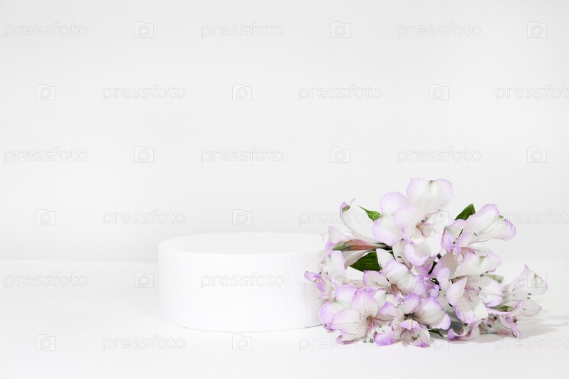 Цилиндрический белый подиум на бело-сером фоне с жесткими тенями и сиреневыми цветами альстромерии. Минимальная пустая сцена презентации косметического продукта. Геометрический подиум