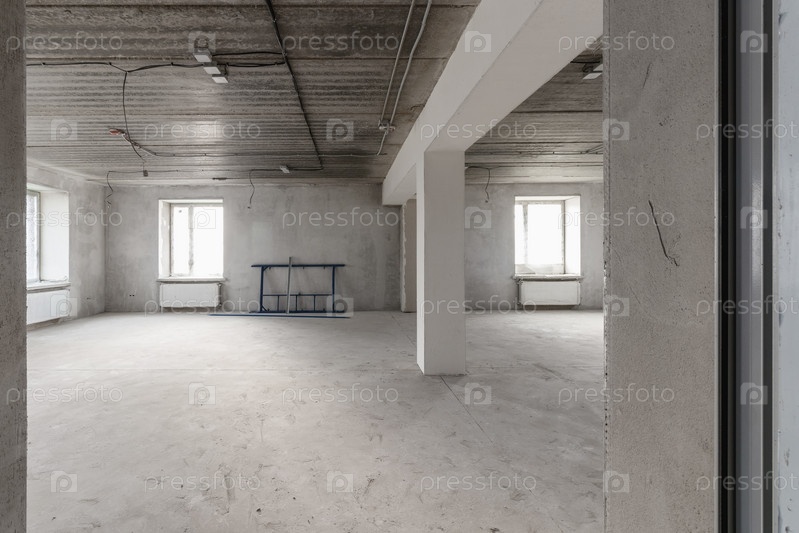 Просторные пустые комнаты пола после заполнения работы на стене и потолке