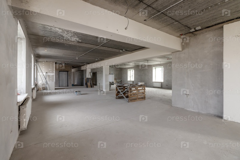 Просторные пустые комнаты пола после заполнения работы на стене и потолке