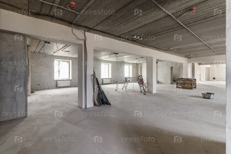 Просторные пустые комнаты пола после заполнения работы на стене и потолке