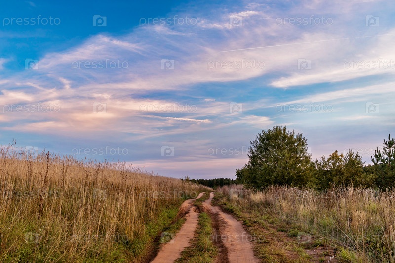 Пейзаж с грунтовой дорогой в поле осенним вечером