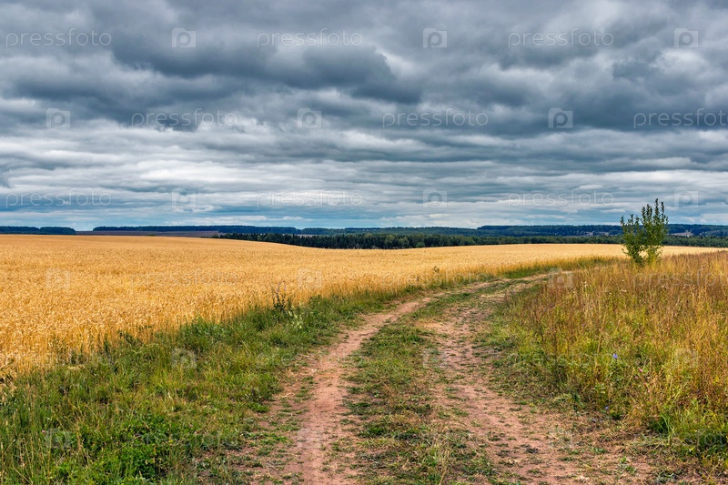 Пейзаж с полем спелой пшеницы в пасмурный день