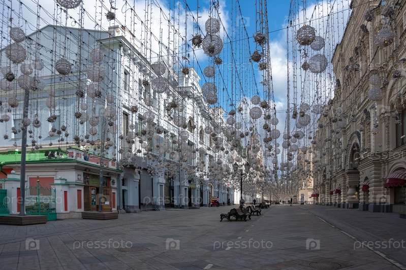 Москва, Россия - 23 марта 2020 г.: украшение пешеходной улицы Никольской шарами и гирляндами