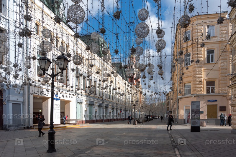 Москва, Россия - 23 марта 2020 г.: украшение пешеходной улицы Никольской шарами и гирляндами