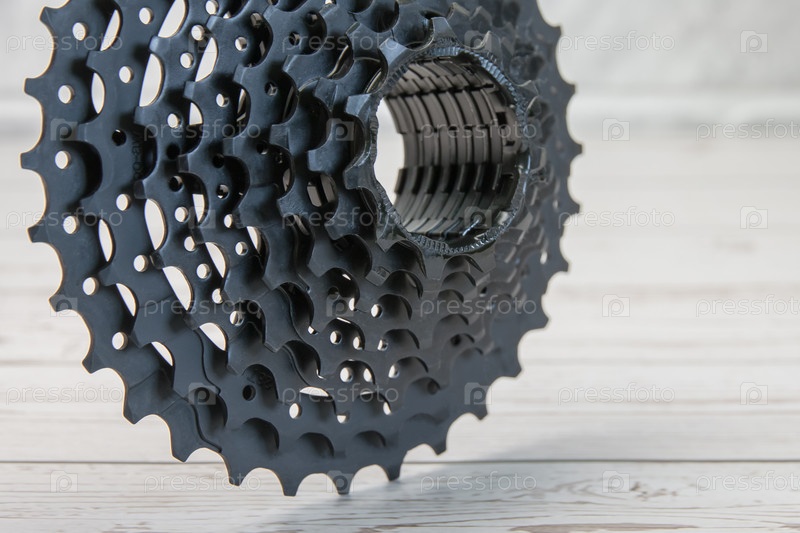 Новая черная велосипедная кассета стоит с зубами на деревянном фоне