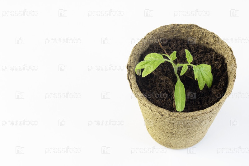 Процесс выращивания рассады в домашних условиях. Горшок с рассадой помидоров, изолированные на белом фоне. Сельское хозяйство