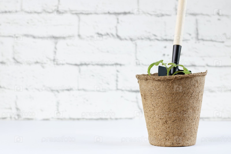 Процесс выращивания рассады в домашних условиях. Горшок с рассадой помидоров и лопатой на белом сером фоне. Сельское хозяйство