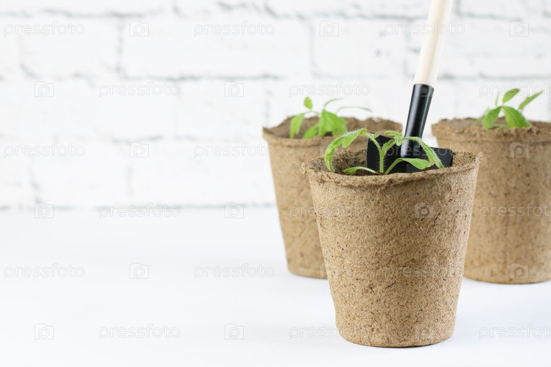 Процесс выращивания рассады в домашних условиях. Горшки с рассадой помидоров и лопатой на белом сером фоне. Сельское хозяйство