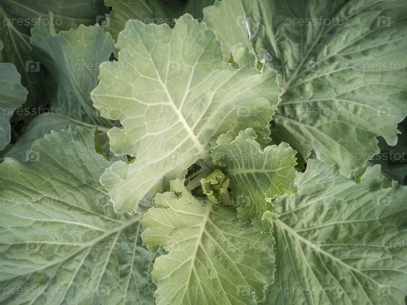 Белокочанная капуста растет в огороде. Вид сверху, крупный план