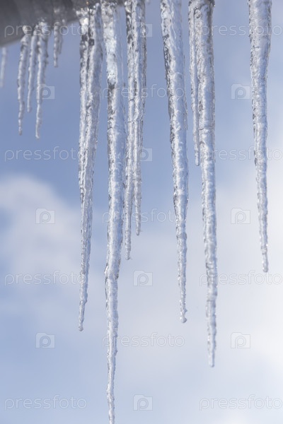 С крыши дома свисают длинные ледяные сосульки. Представлено на фоне голубого неба с облаками