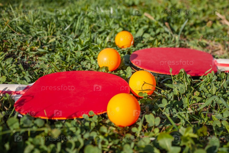 Две красные ракетки и четыре оранжевых мяча для настольного тенниса лежат на зеленой траве