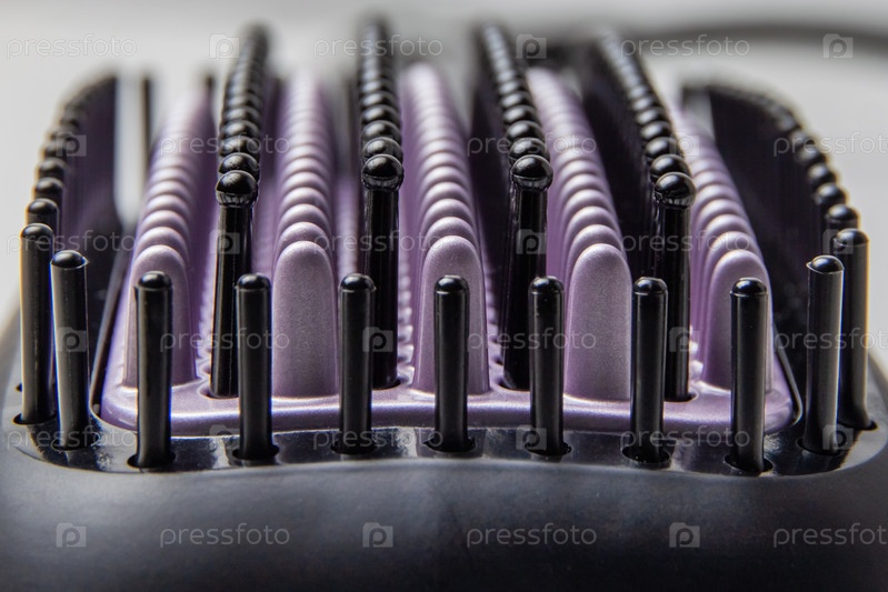 Черные и фиолетовые щетинки электрической термощетки для выпрямления волос на макросъемке. Выборочный фокус