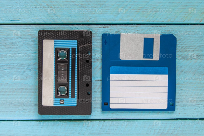 Аудиокассета в черном пластиковом корпусе и синяя дискета лежат на синем деревянном фоне