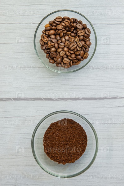 Кофейные зерна и молотый кофе в стеклянных мисках на деревянном фоне