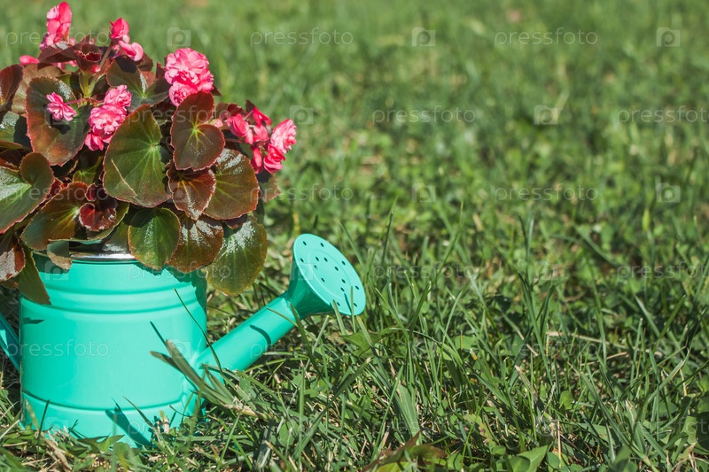 Комнатный цветок Бегония в декоративной зеленой лейке стоит в траве. Место для вашего текста