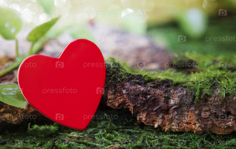 Красное сердце лежит на мху, рядом с корой дерева и ветвями с листьями, на фоне боке. Концептуальная открытка ко Дню святого Валентина, экология. Копировать пространство
