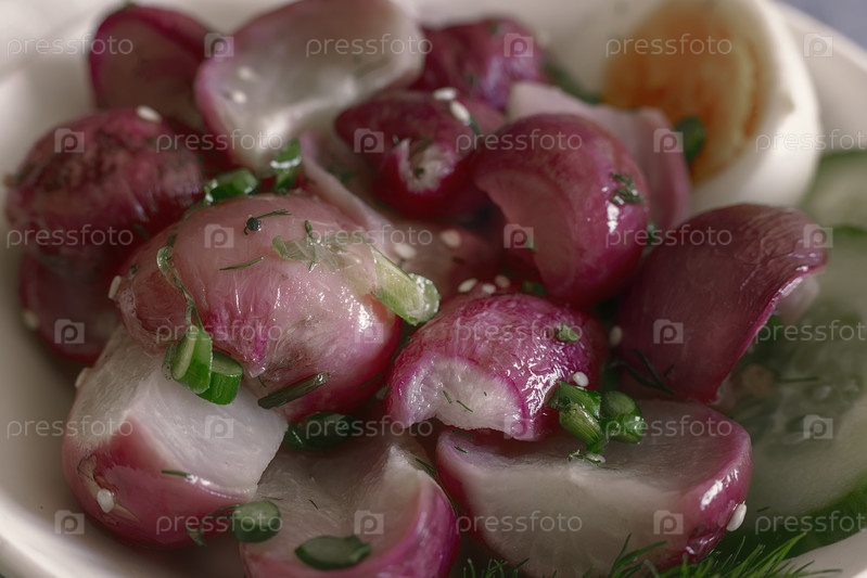 На столе на тарелке запеченная редька с зеленым луком и зеленью. Представлено крупным планом