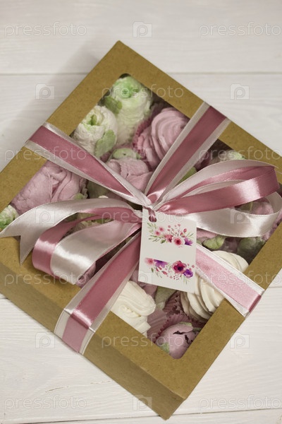 Домашний зефир в картонной коробке. Зефир цветы. Подарочная упаковка. Перевязан лентой