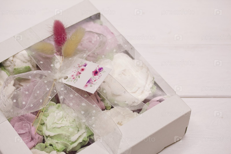 Домашний зефир в картонной коробке. Зефир цветы. Подарочная упаковка. Перевязан лентой
