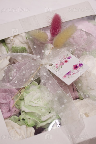 Домашний зефир в картонной коробке. Зефир цветы. Подарочная упаковка. Перевязан лентой. Крупный план
