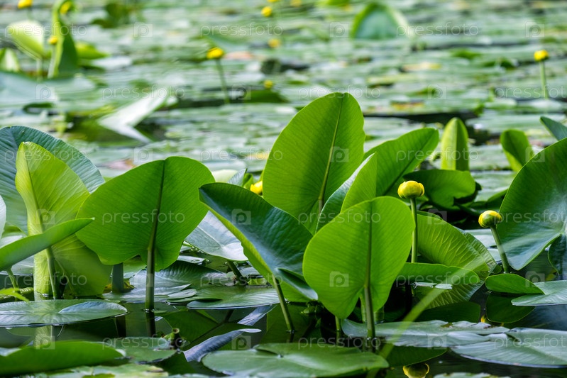 Крупный план желтого стручка водного растения в пруду летом